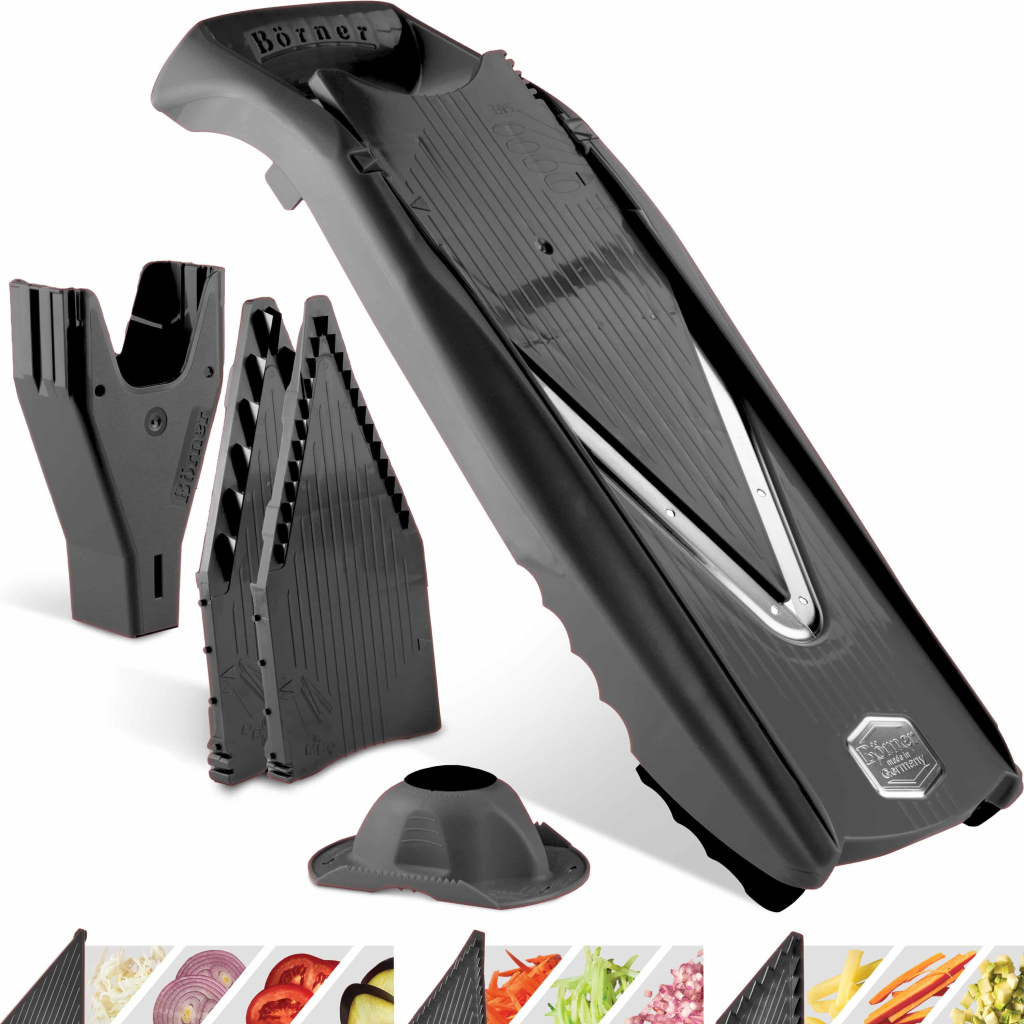 Новая версия оригинальной овощерезки Börner позволит Вам работать ещё более безопасно, точно и быстро, чем когда-либо прежде. Вам предлагается широкий выбор вариантов нарезки: ломтиками, соломкой в четырех вариантах, а также различными кубиками. В общей сложности доступно 10 вариантов нарезки.